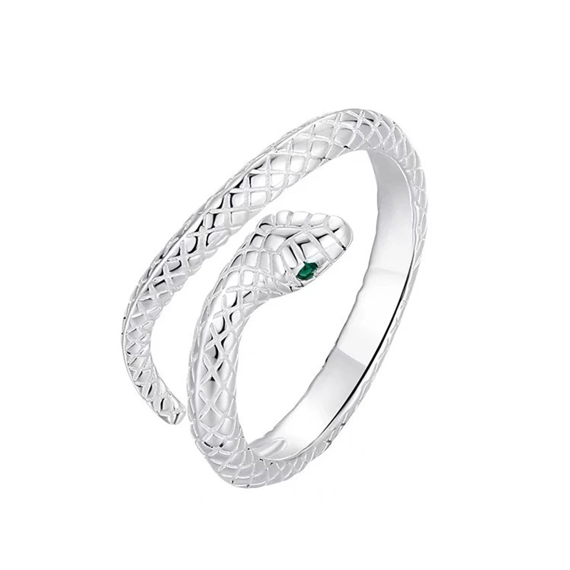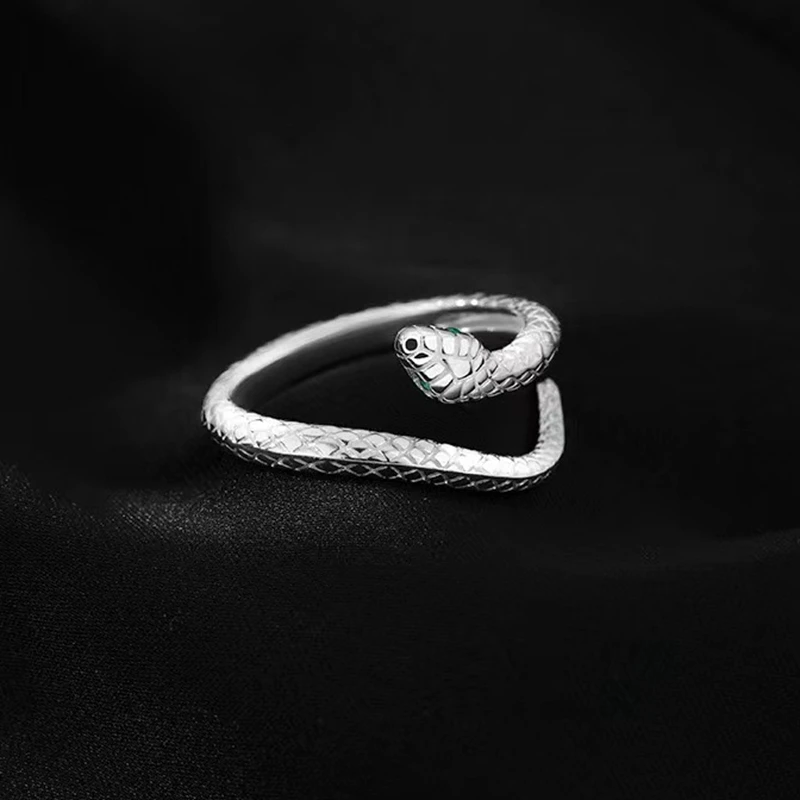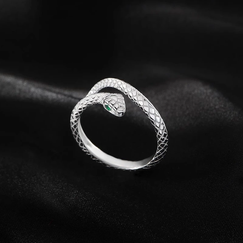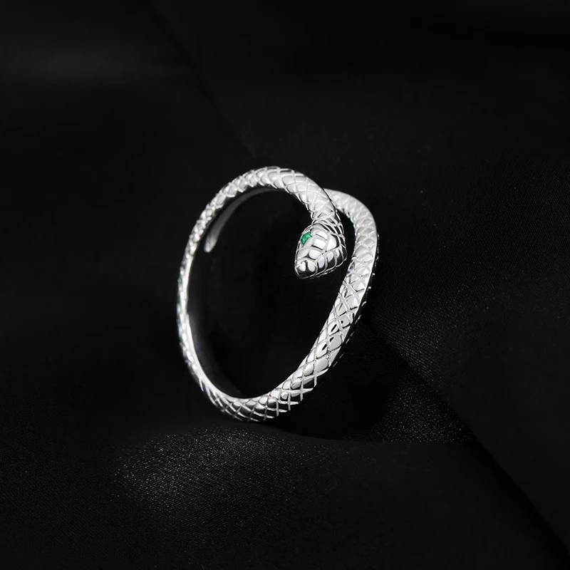 Su cuerpo sinuoso se ajusta con gracia al dedo, y su brillo lo aportan circonias que simulan el destello hipnótico de una mirada salvaje.